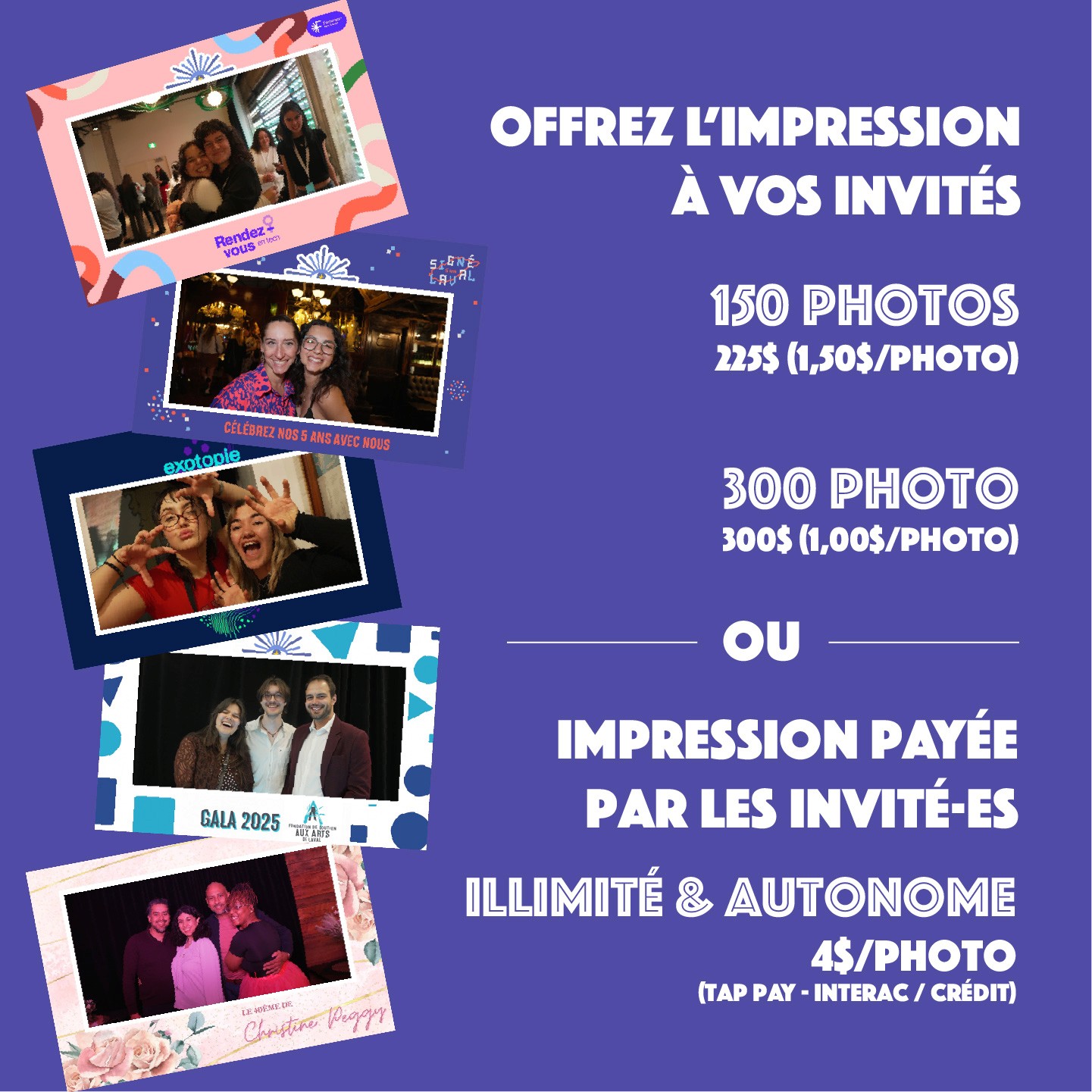 Choisissez l’option qui vous convient : impressions offertes à tous vos invités, ou disponibles à l’achat directement sur place.